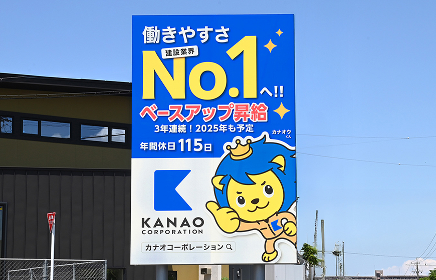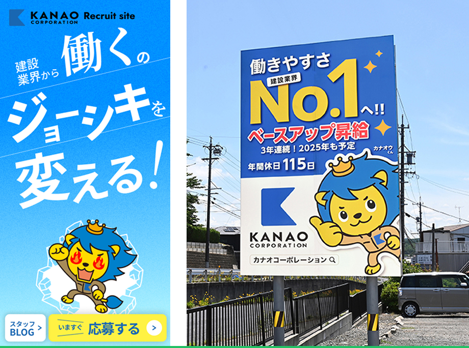 採用強化の一環として看板ブランディングをスタートしました。より印象に残るキャラクターを掲載することになったのですが、クラウドソーシングのデザインに納得できず、最終的にライオンハートに依頼することに。その結果、新3K(帰れる・稼げる・叶えられる)を体現する「地域No.1のカナオウくん」が誕生しました。キャラを中心に企業イメージが統一されたおかげで、意思決定が早くでき採用サイトの制作もスムーズ。看板での認知拡大も進み、採用での効果に繋がっています。